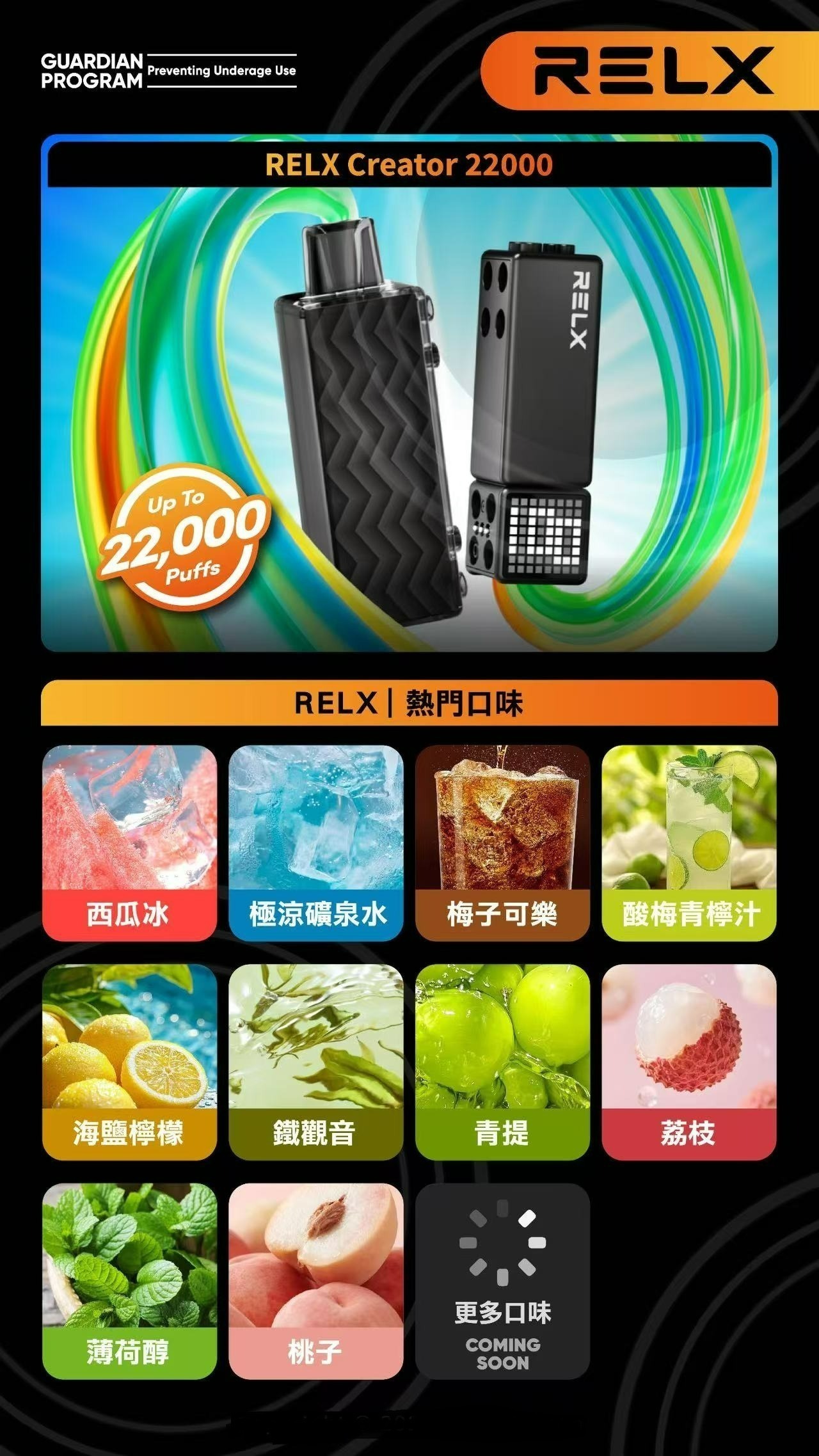 此外,Creator 配備 17mL 超大煙油容量 與 800mAh 循環電池,一次加滿即可滿足長時間使用,最高支援 22,000 口,大幅減少頻繁更換。搭配 RELX 精選的十種人氣風味,帶來豐富的味覺驚喜。