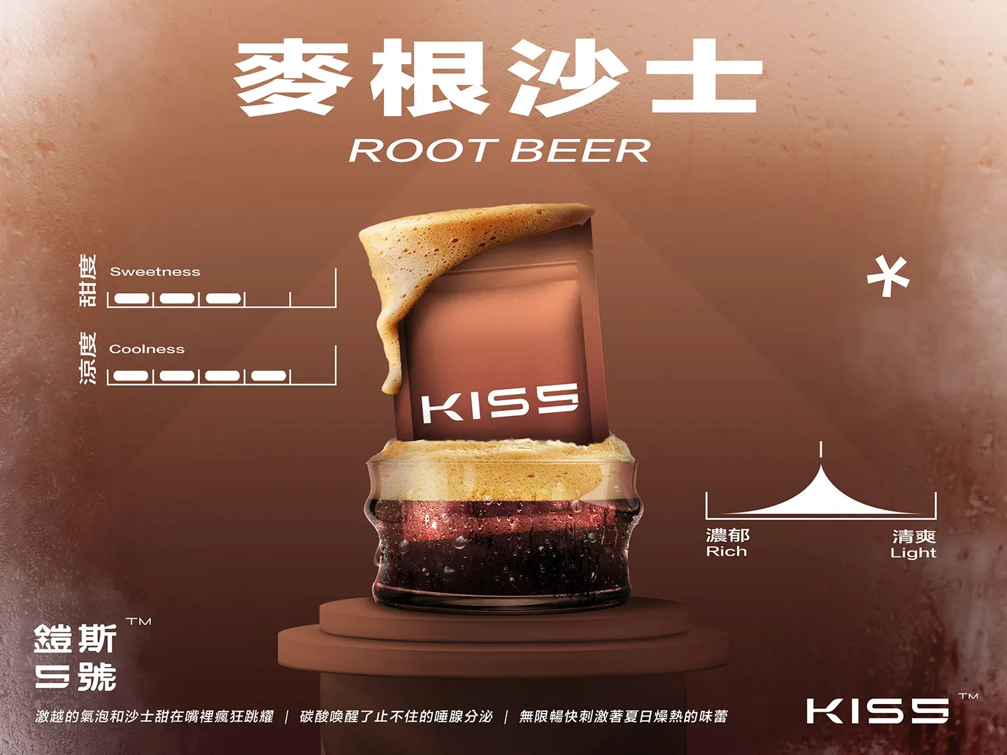 • ▶ 麥根沙士【甜度 6/涼度 8/口感 濃郁5】激越的氣泡和沙士甜在嘴裡瘋狂跳躍,碳酸喚醒了不住的唾腺分泌,無限暢快刺激著夏日燥熱的味蕾。