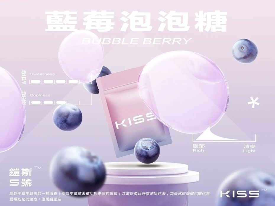 • ▶ 藍莓泡泡糖【甜度 9/涼度 5/口感 濃郁8】綠野平疇中難得的一抹清香,空氣中環繞著童年與夢想的編織,含蓄絲柔且靜謐地陪伴著,煩憂就這麼被包圍化無,藍莓幻化的魔力,溫柔且堅定。